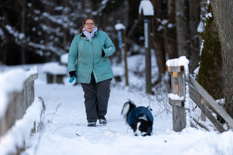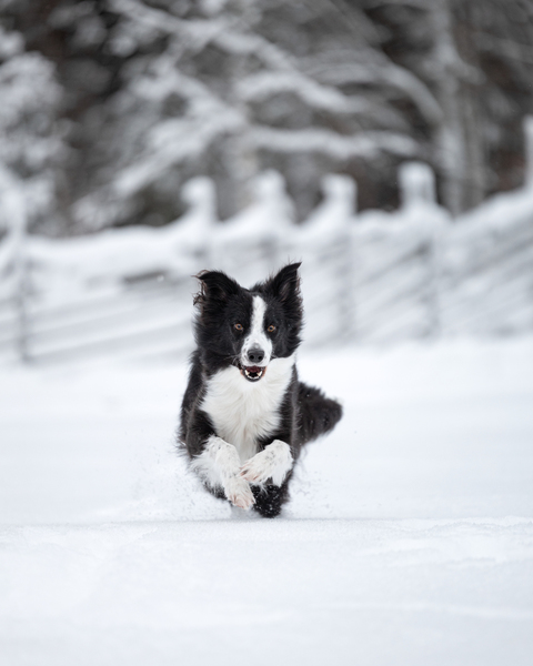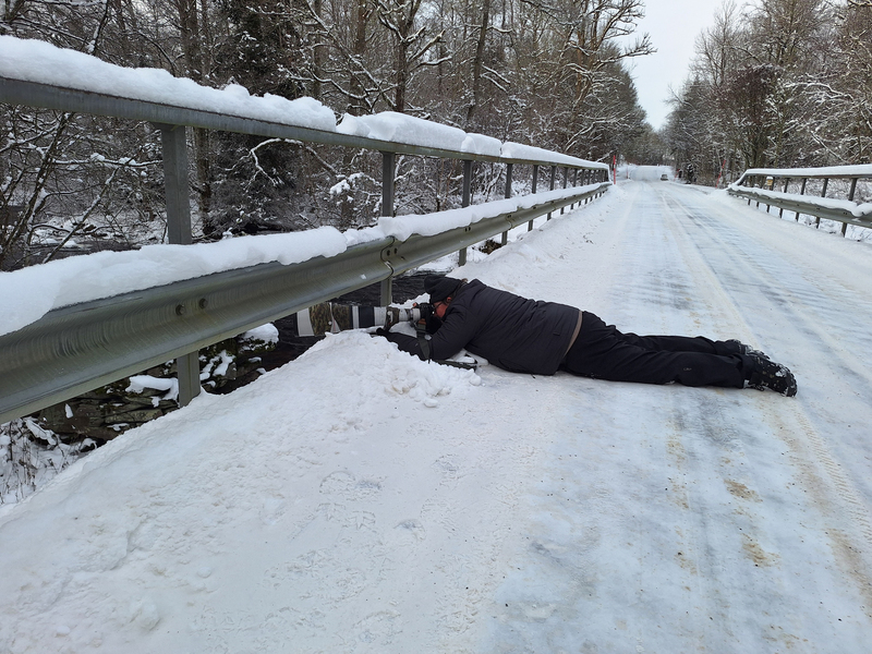 Da die Situation nicht zu ändern ist und es auch nichts nützt, Trübsal zu blasen, fahren wir wie geplant zur Wasseramsel an die Åsenån. Und siehe da, sie ist sogar zu Hause. Währen Clemens auf einer Brücke Stellung bezieht, dreht Annika eine kleine Runde mit dem Hund durch den Tiefschnee. James ist, im Gegensatz zu seinem Vorgänger Spyke, kein großer Freund von Schnee. Und dass er Herrchen allein lassen muss, gefällt ihm auch nicht. Erst als Annika ein Stöckchen findet und ein kleines Spiel mit ihm anfängt, ist er etwas abgelenkt.