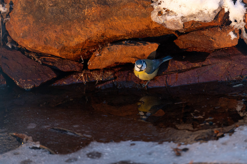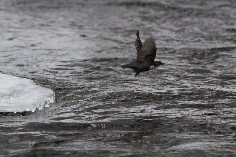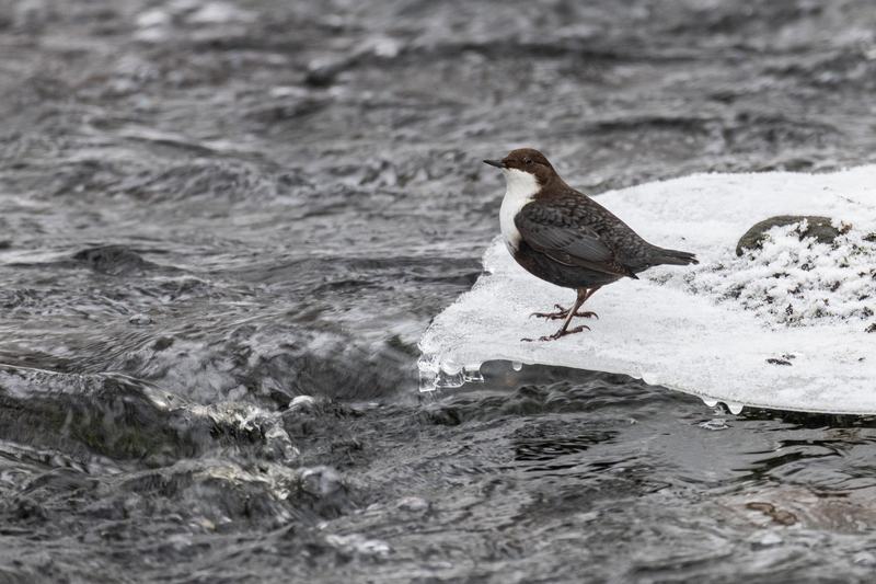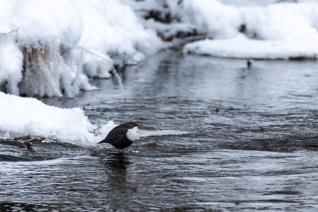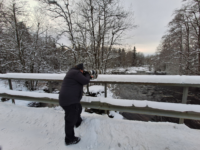 Der Wetterbericht verspricht noch einmal schönes Wetter, wenn auch nicht so schön, wie in den letzten Tagen. Das merkt man schon daran, dass es erst so gegen 10 Uhr halbwegs hell wird. Die Sonne hält sich auch bedeckt, dafür ist es halbwegs hell. Und weil dem so ist, fährt Clemens nach dem Frühstück noch einmal zur Wasseramsel. Diese (genau genommen sind es zwei) wohnt nur wenige Kilometer nördlich von Rydaholm und lässt sich perfekt von einer Brücke aus beobachten. Es sind gleich mehrere Stellen links und rechts der Brücke, die gute Einblicke ins Revier ermöglichen. So dauert es auch nur wenige Minuten, bis sie sich auf einem Schnee- und Eisverzierten Stein zeigt und zu mehrfachen Tauchgängen ansetzt. Ich sehe ihr fasziniert zu und freue mich, dass ich ungefähr 8 Schichten Bekleidung anhabe und mein Mittagessen nicht aus dem Fluss ertauchen muss.