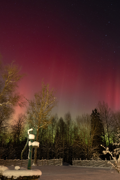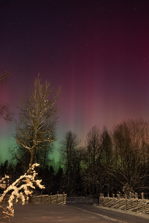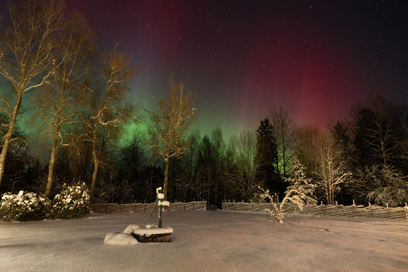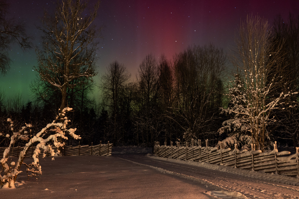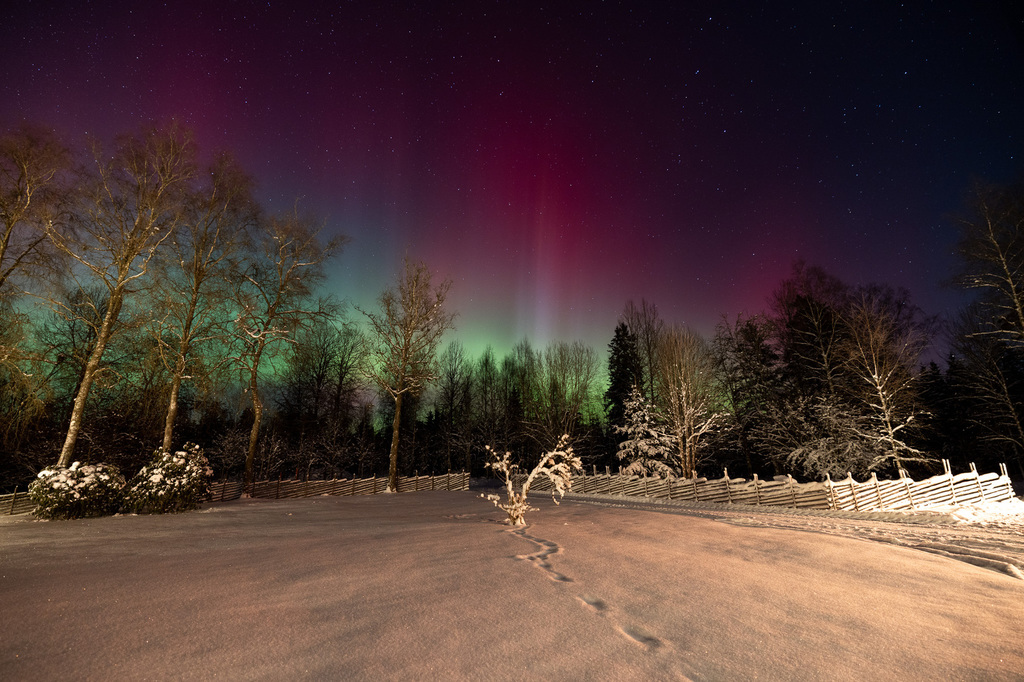 Zum Abendessen gibt es das, was es bei uns immer am ersten Abend gibt: Spaghetti Bolognese. Geburtstag hin oder her – Ordnung muss sein. Dann wird gepuzzelt. Ein Pling auf dem Handy kündigt die Nachricht an, dass es im Laufe des späten Abends Chancen auf Polarlichter geben wird. Auch wenn es schwerfällt, halten wir uns daher noch wach und schauen immer mal wieder in den Himmel gen Norden. Und tatsächlich, kurz vor Mitternacht verfärbt sich der Himmel lila und grün. Mit bloßem Auge kann man es gerade so erkennen, die Kameras nehmen das Spektakel natürlich noch viel intensiver wahr. Und so stehen wir eine knappe Stunde bei -15°C in „unserem“ Vorgarten und fotografieren den Nachthimmel. Farbenfroher und versöhnlicher kann ein Geburtstag wohl nicht enden.