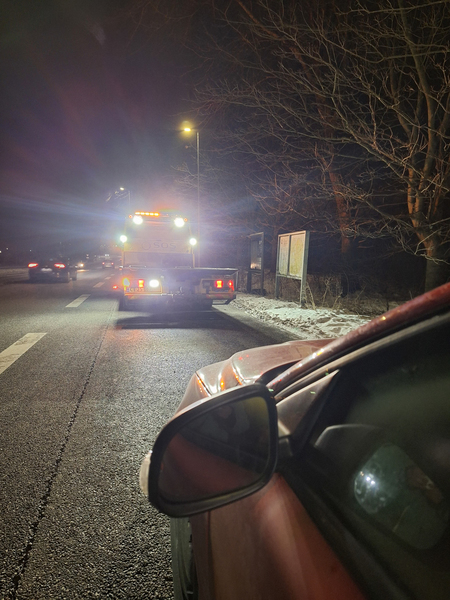 Etwas 10km vor dem Fährhafen, mitten auf einer vielbefahrenen Landstraße gibt es plötzlich ein dumpfes PFUMP, der Wagen nimmt kein Gas mehr an, rollt aus und bleibt schließlich stehen. Der Motor gibt keinen Mucks mehr von sich. Selbst der Warnblinker setzt immer wieder aus, was bei der bereits eingetretenen Dämmerung ein zusätzliches Problem an der Stelle ist. Durch Zufall kommt eine Polizeistreife vorbei, sichert uns mit Blaulicht ab und hilft, den Wagen ca. 200m weiter in eine Parkbucht zu schieben.