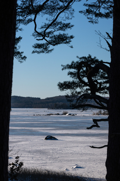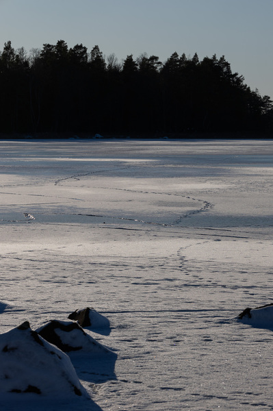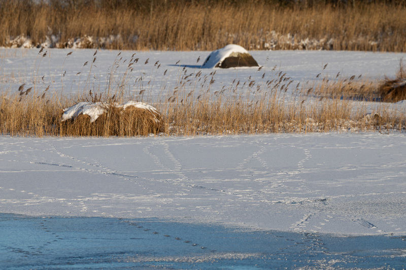 Gleich neben dem Bjurkärr liegt die Landzunge Hunshult. Hier machen wir auch noch einen Stopp, um vom Steg aus über die zugefrorenen Seen zu blicken. Vom Parkplatz geht es ein kleines Stück an der Straße entlang und dann durch den Wald zum Schilfgürtel. Plötzlich ruft Clemens „Otter“ und richtig, ein Fischotter läuft quer über den See und sucht immer wieder Schutz in den kleinen Schilfinseln. Es braucht sicherlich keine Erwähnung, dass Annika gar keinen Fotoapparat dabei hat und Clemens das falsche Objektiv. Zwar wechselt er noch schnell auf etwas Langstreckentaugliches, doch als alles an seinem Platz ist, huscht der Otter ins Schilfdickicht am Ufer. Schade, dass kein Foto zustande kam, aber ein tolles Erlebnis allemal!