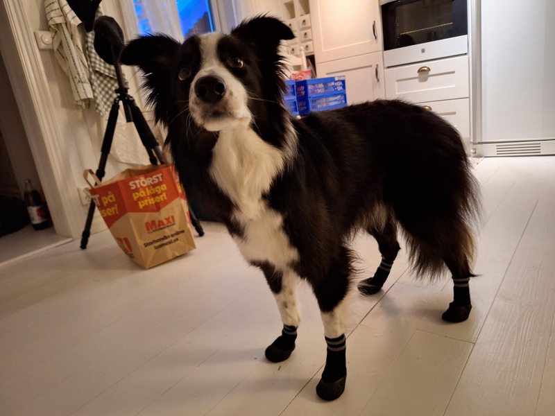 Danach geht es noch einmal in den örtlichen Tiershop, wo Annika wieder ihr Schwedisch auf die Probe stellen und mit der Verkäuferin über Border Collies fachsimpeln kann. (Deutlich günstiger als Fachgespräche beim Tierarzt – siehe Tagebuch aus dem April 2025). James hat nun nämlich Gummisocken bekommen, damit er auch unfallfrei die etwas steile und sehr rutschige Treppe im Ferienhaus runterkommt. Er findet sie völlig überflüssig, wir sind aber jedes Mal froh, wenn er heil unten ankommt.